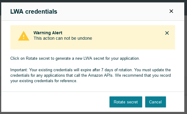 For more information, refer to Rotating your application's LWA credentials in the Amazon Services API documentation.