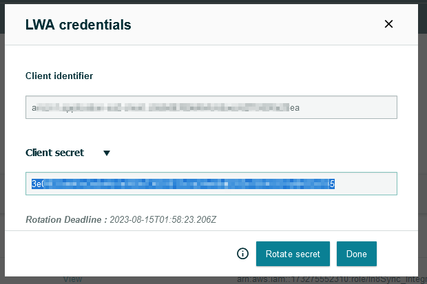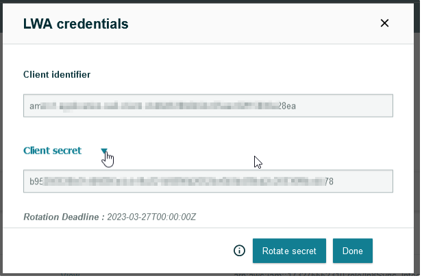 Click again on Rotate Secret, then the LWA Credentials will pop up again with the NEW Secret. Click again on the Drop Down Arrow next to Client Secret to see new Rotation Deadline and copy the New Secret