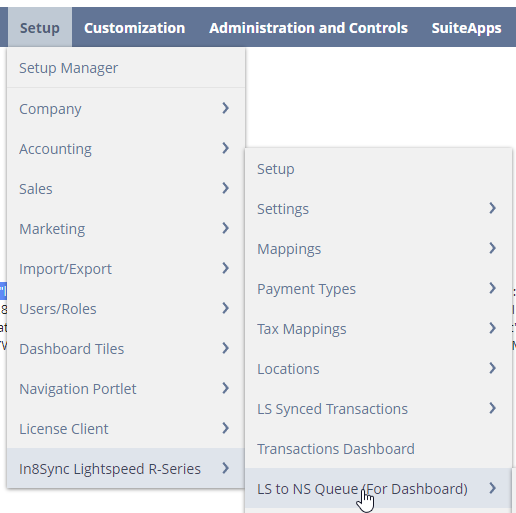 Setup Tab > In8Sync Lightspeed R-Series >LS to NS Queue (For Dashboard)
