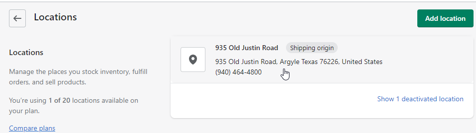 Configuration on Shopify Locations settings page is also required (below).