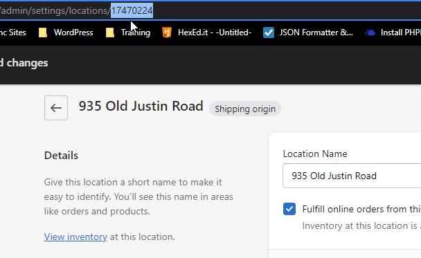 Click on the location in Shopify to get the id for that